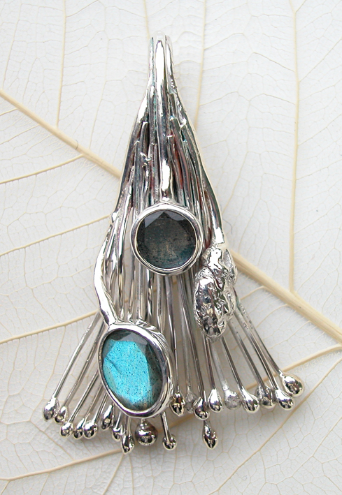 Ausgefallener Labradorit Anhänger Silber 925 mit facettiert geschliffenem und in Silber gefasstem Labradorit, der wunderschön farbig ist und bläulich schimmernd als Statement Anhänger, sehr hübsch und besonders. Wie Silberfäden, die fächerartig nach unten ausgestellt sind und am unteren Ende kleine Silberkügelchen besitzen, fasst ein Silberfaden am Rand den Anhänger quasi zusammen, an dessen unterem Ende ein Labradorit Stein angebracht ist.