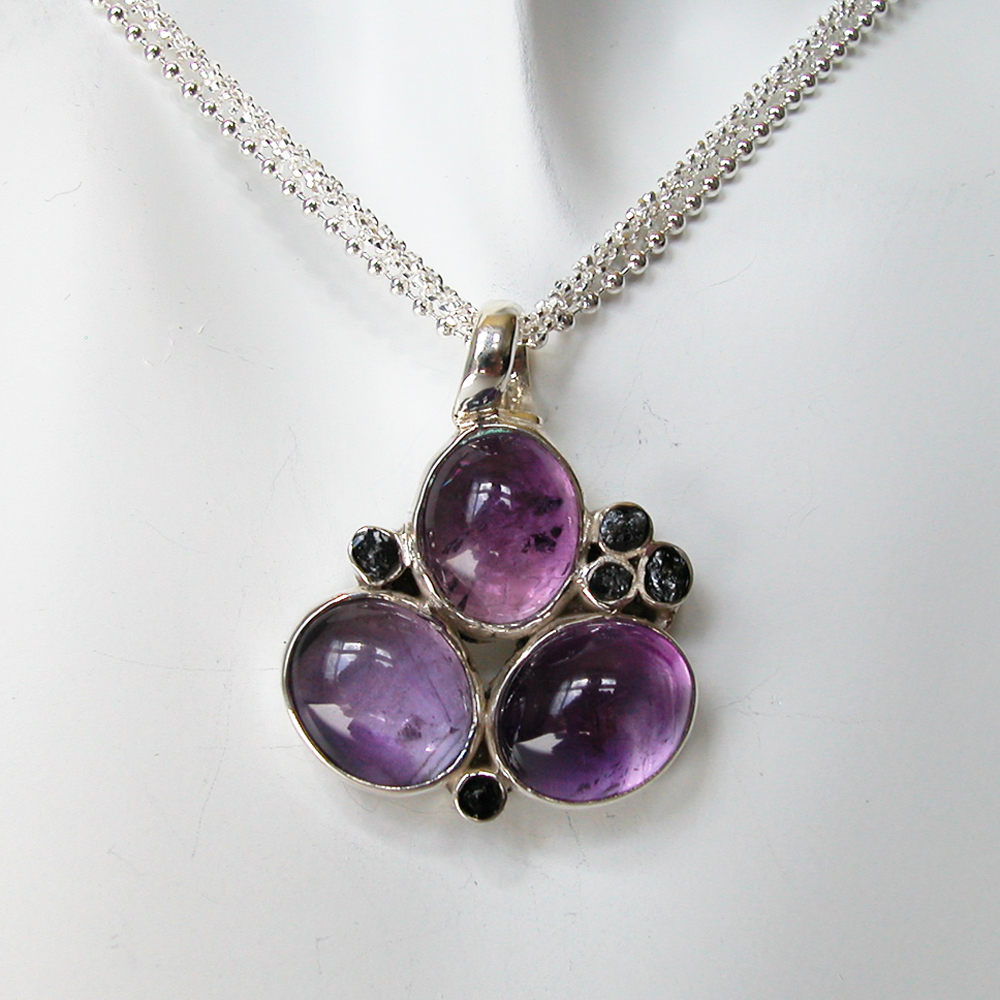 3 oval-rund geschliffene Amethyst Steine sind als Dreieck angeordnet und in Silber gefasst,