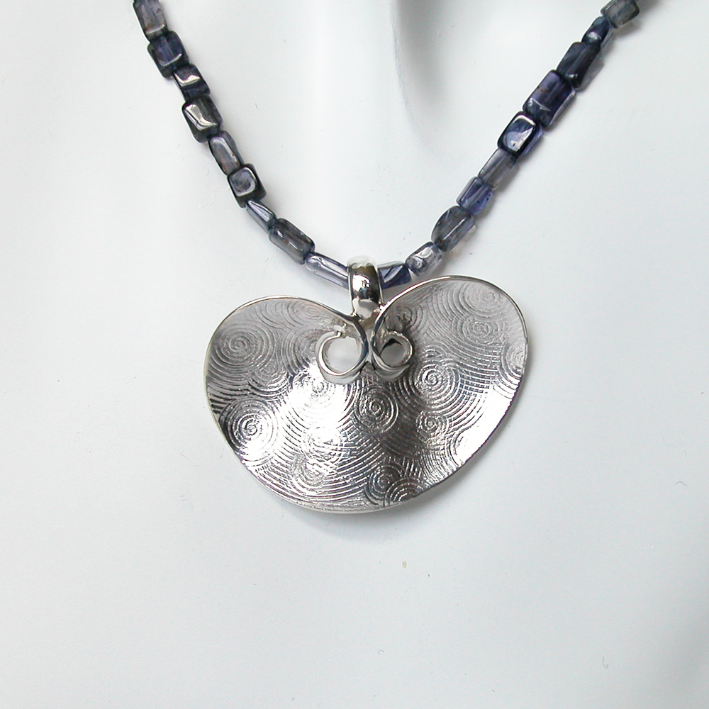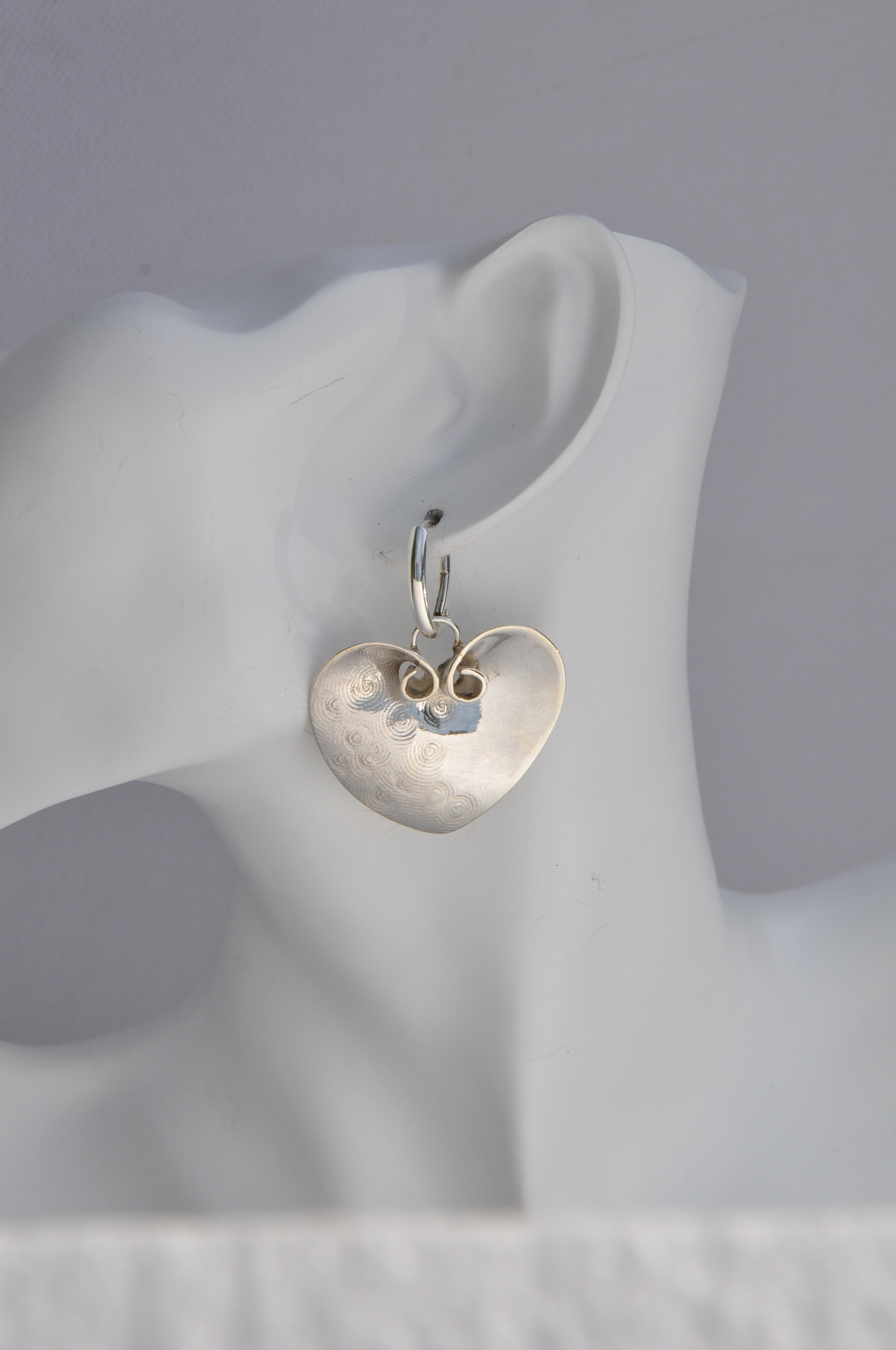 Anhänger Herzchen aus 925er Silber, glänzend und mit eingeprägten kreisförmigen Ornamenten.