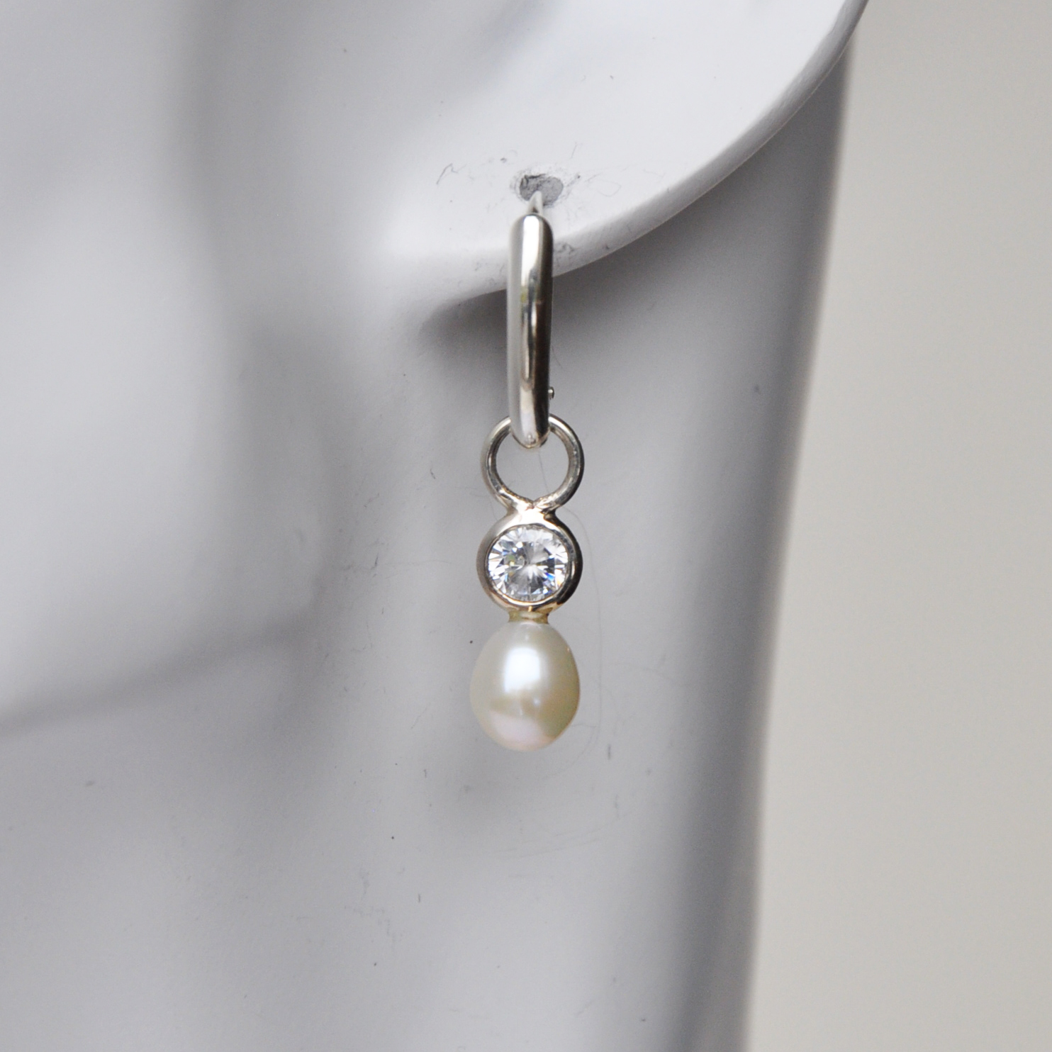 Atemberaubend schöne Ohrhänger mit einem geschliffenen und wunderschön funkelndem Zirkon, auf der Rückseite flach und vorne konisch geformt und in Silber gefasst. Daran wurde eine oval-runde Perle befestigt und diese edlen und dezenten Ohrringe verschönern Ihr Outfit zeitlos und elegant. Die Brisur ist zum Einhängen und Schließen und besteht aus 925 Sterling Silber.