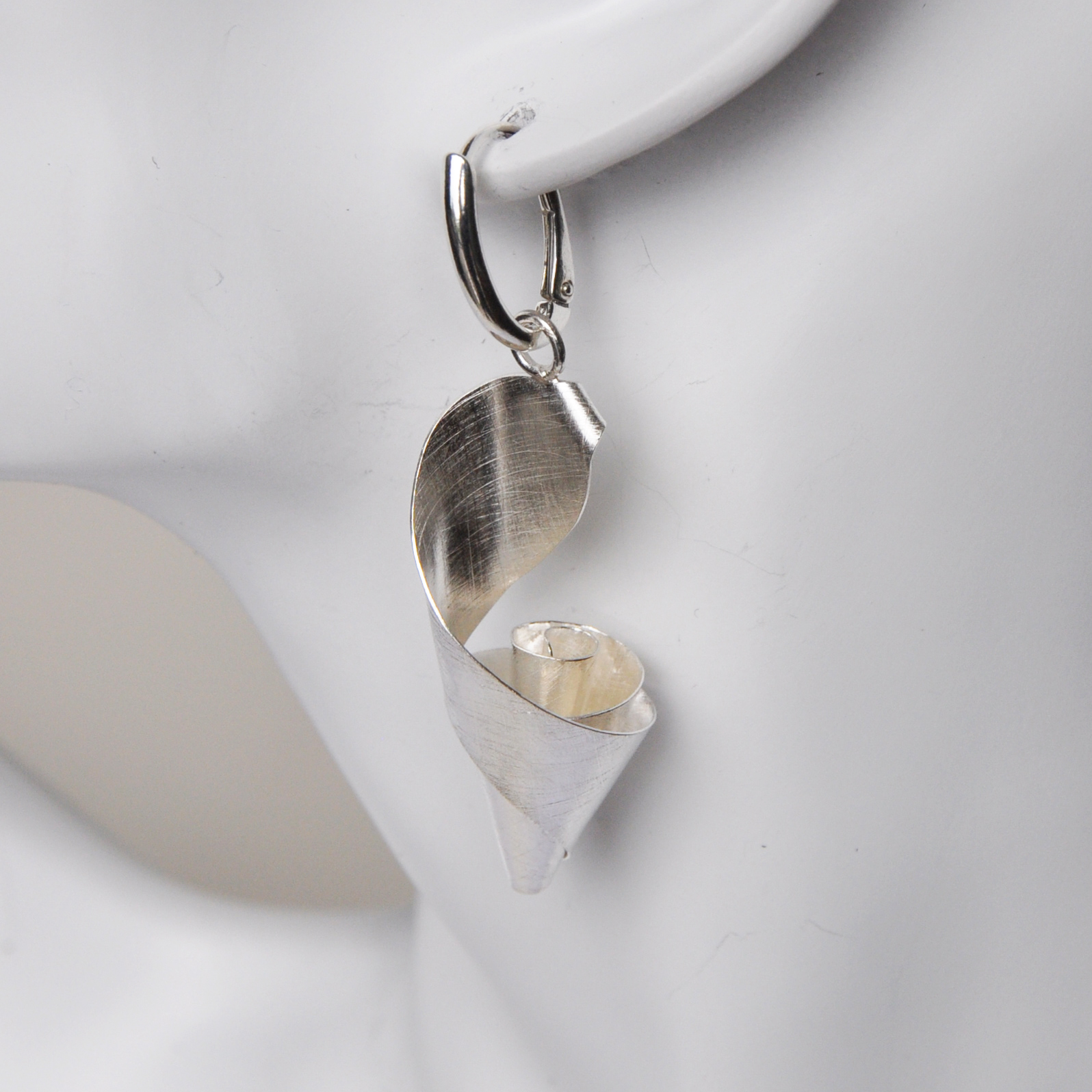 Ausgefallene Silberohrringe, leicht, verspielt und einzigartig - ein ganz besonderes Schmuckstück im Ice-matt Look. In sich gedrehter Streifen aus Silber. Slow Fashion in extravagantem Design und ein absoluter Hingucker.