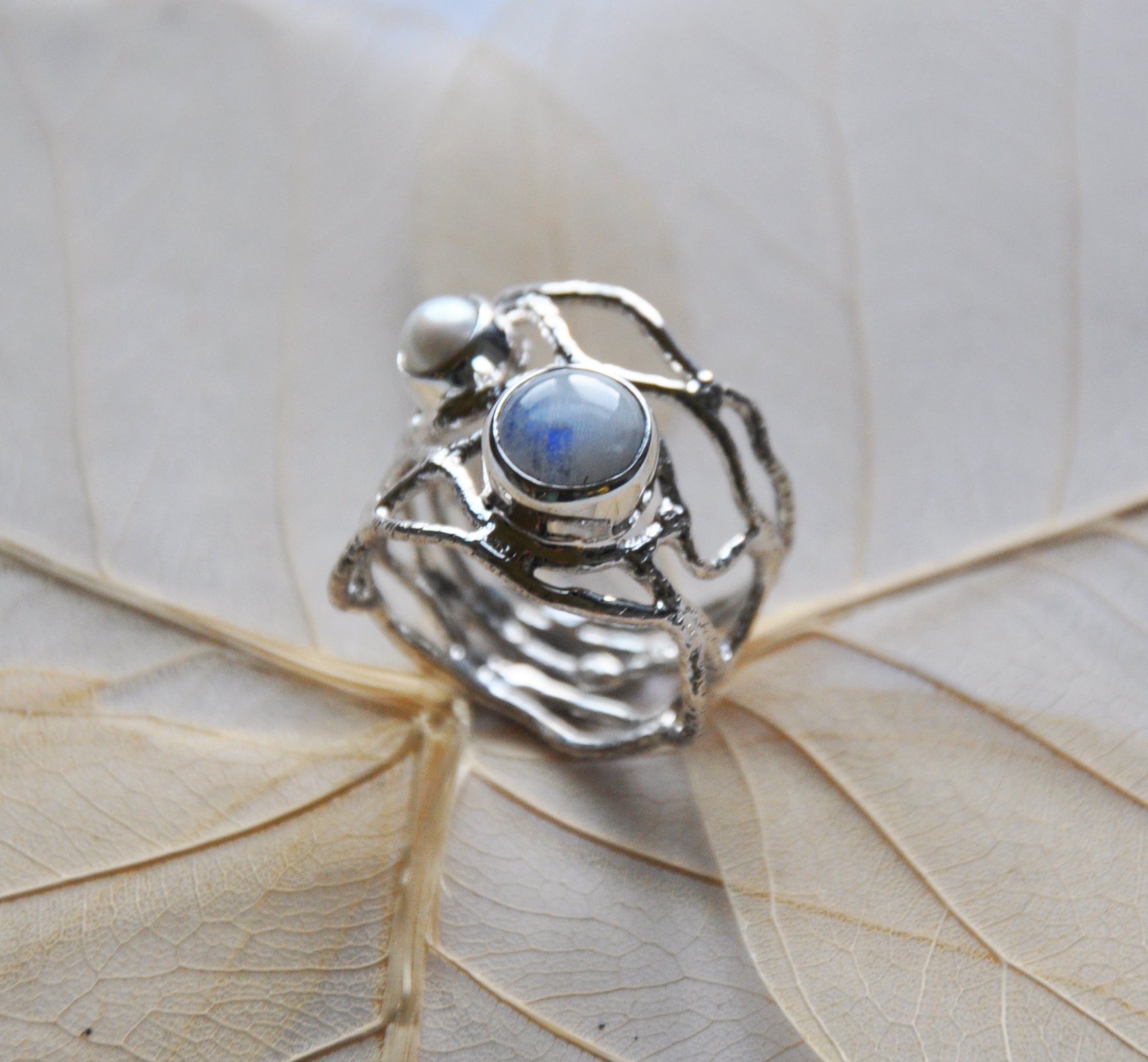 Ring aus Silber mit Regenbogen-Mondstein und Perle Als extravaganter Statement Ring oder Akzent im täglichen Outfit.