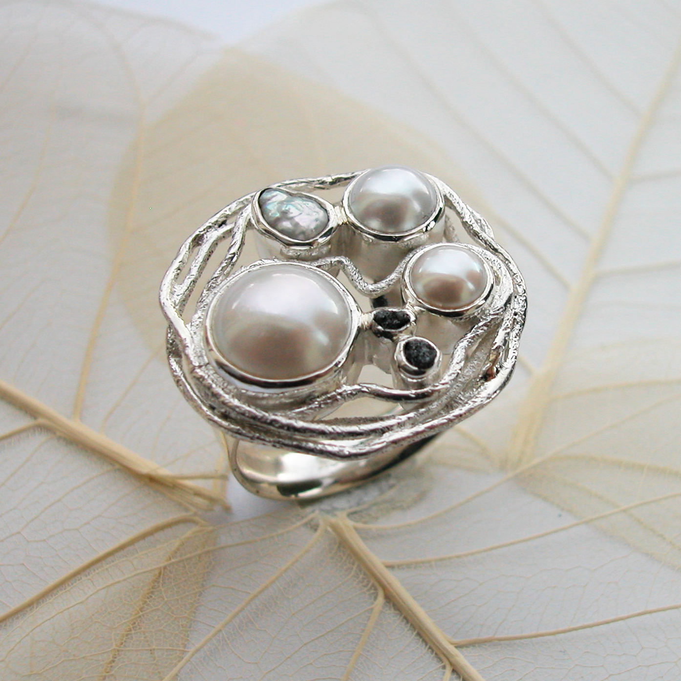 Ein ausgefallener Silberring mit drei wunderschönen Süßwasserperlen (8 mm), einer Perle und zwei daneben angeschmiegten Rohdiamanten. Diese sind in einem Kreis von 2,5 cm Durchmesser angesiedelt, durch den sich zarte Schlangenlinien schlingen.