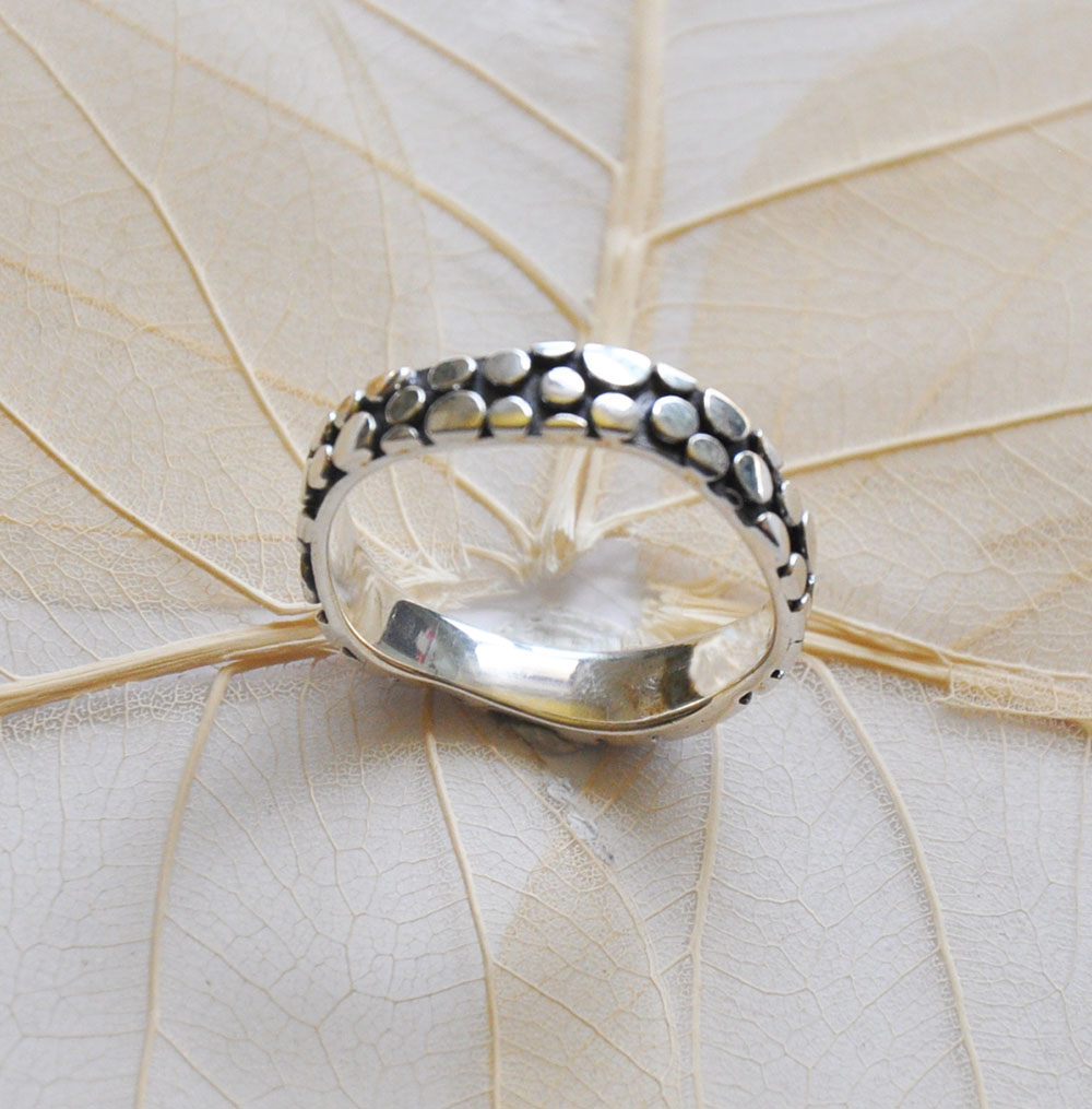 Ausgefallener, schmaler Ring mit kleinen polierten Kreisen auf geschwärztem Untergrund aus Silber in Handarbeit angebracht.