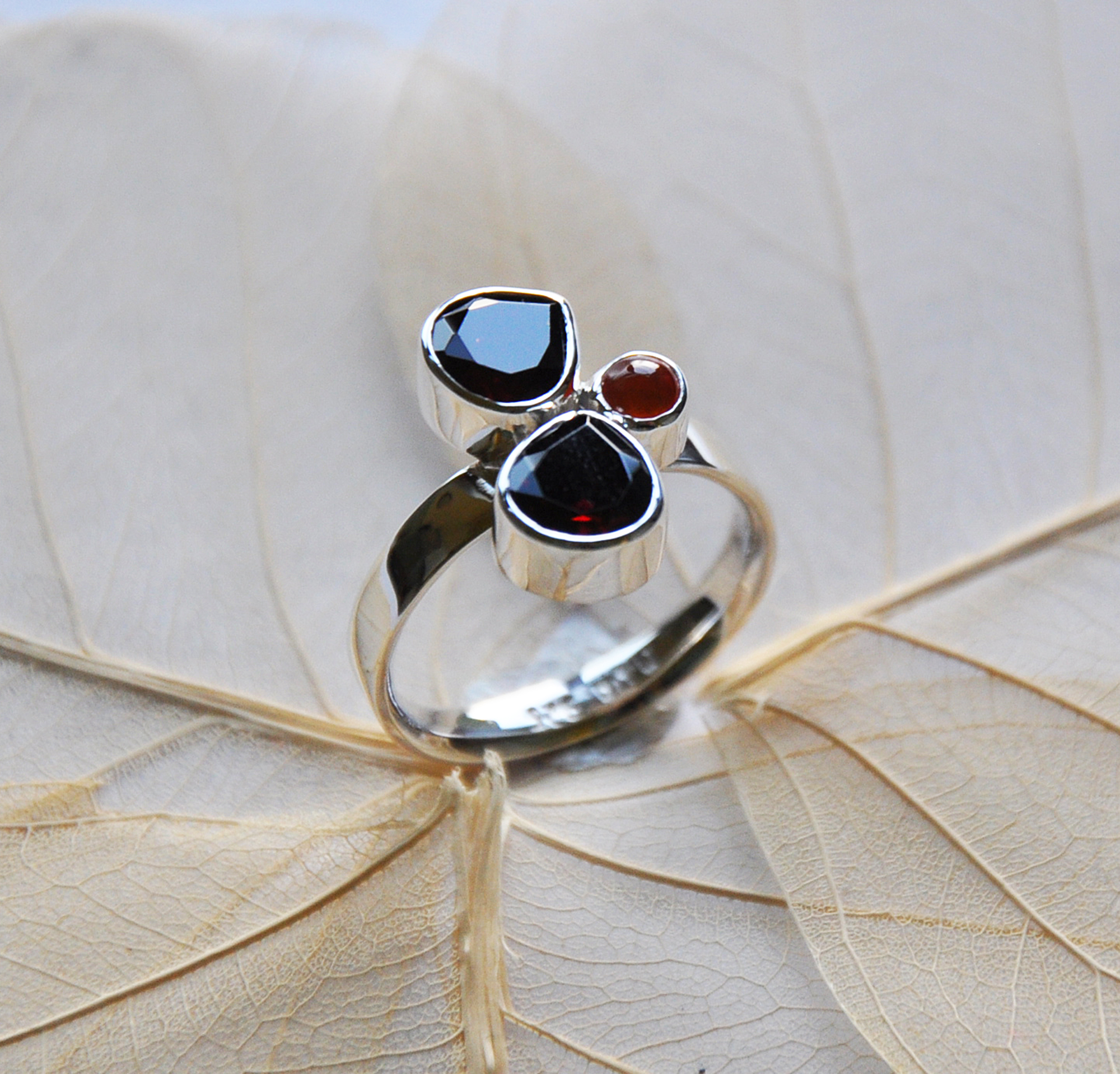 Silberring 925 - extravaganter Statement Ring mit zwei Granattropfen und einem kleinen Karneol. Ein ganz besonderes Schmuckstück. Es ist ein schönes Geschenk für Freunde oder Sie selbst! Design in Deutschland.