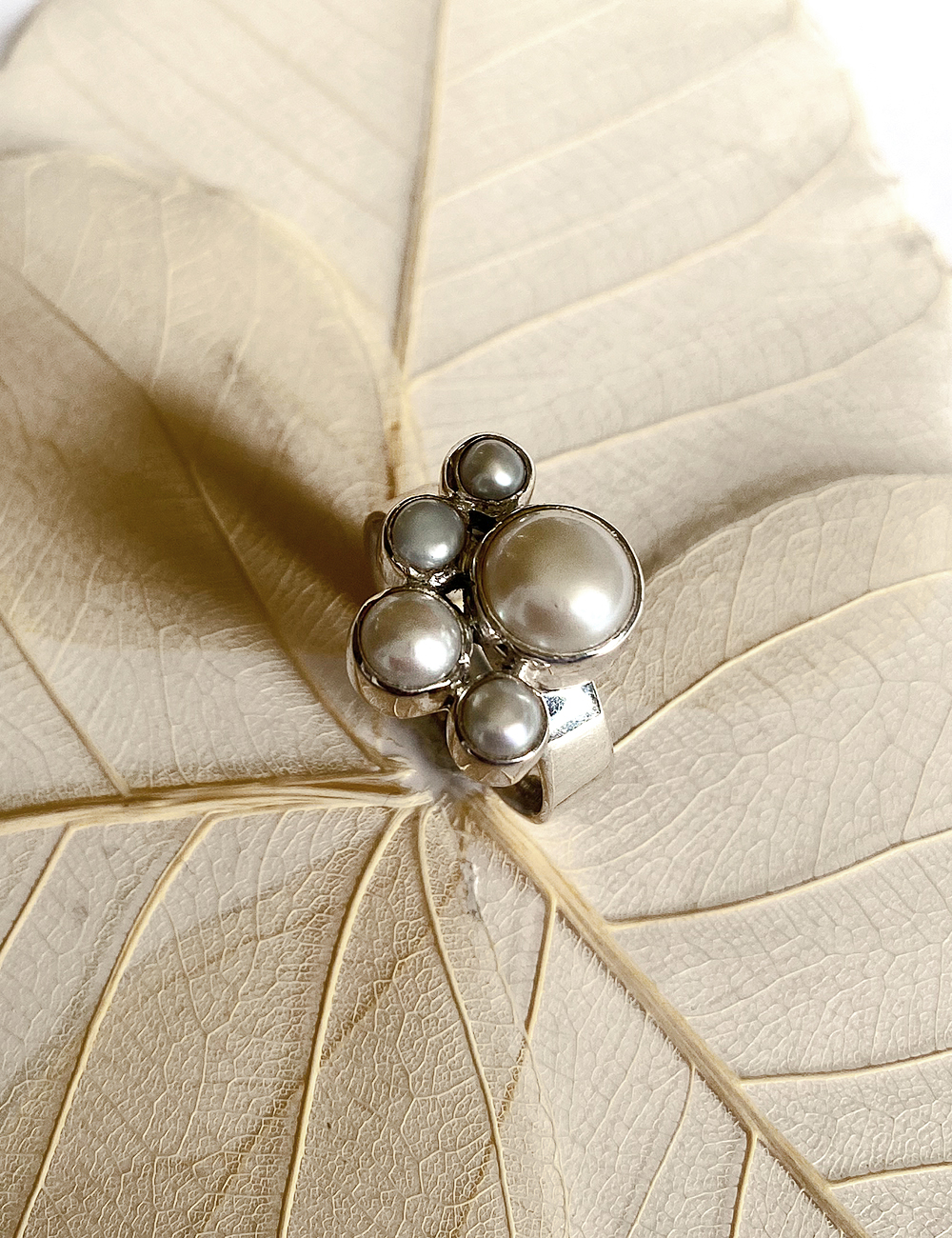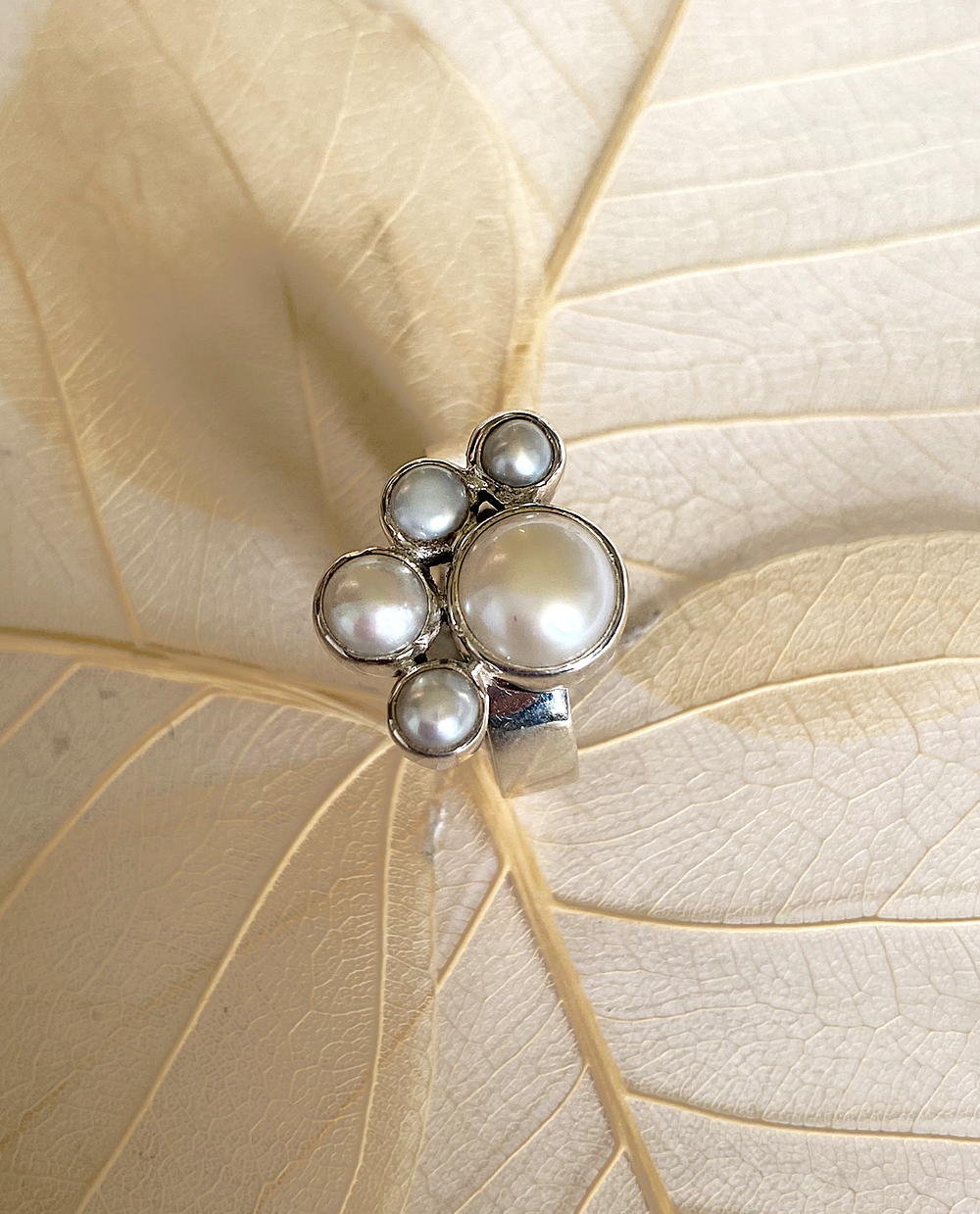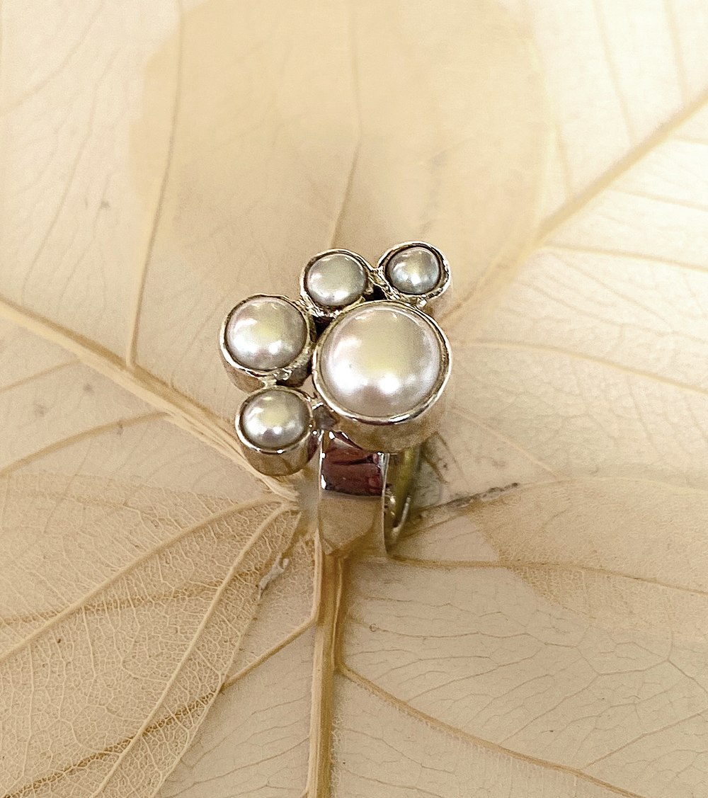 Ring aus Silber mit Perlen, eine große und 4 kleinere, halbkreisförmig um den größeren angeordnet.