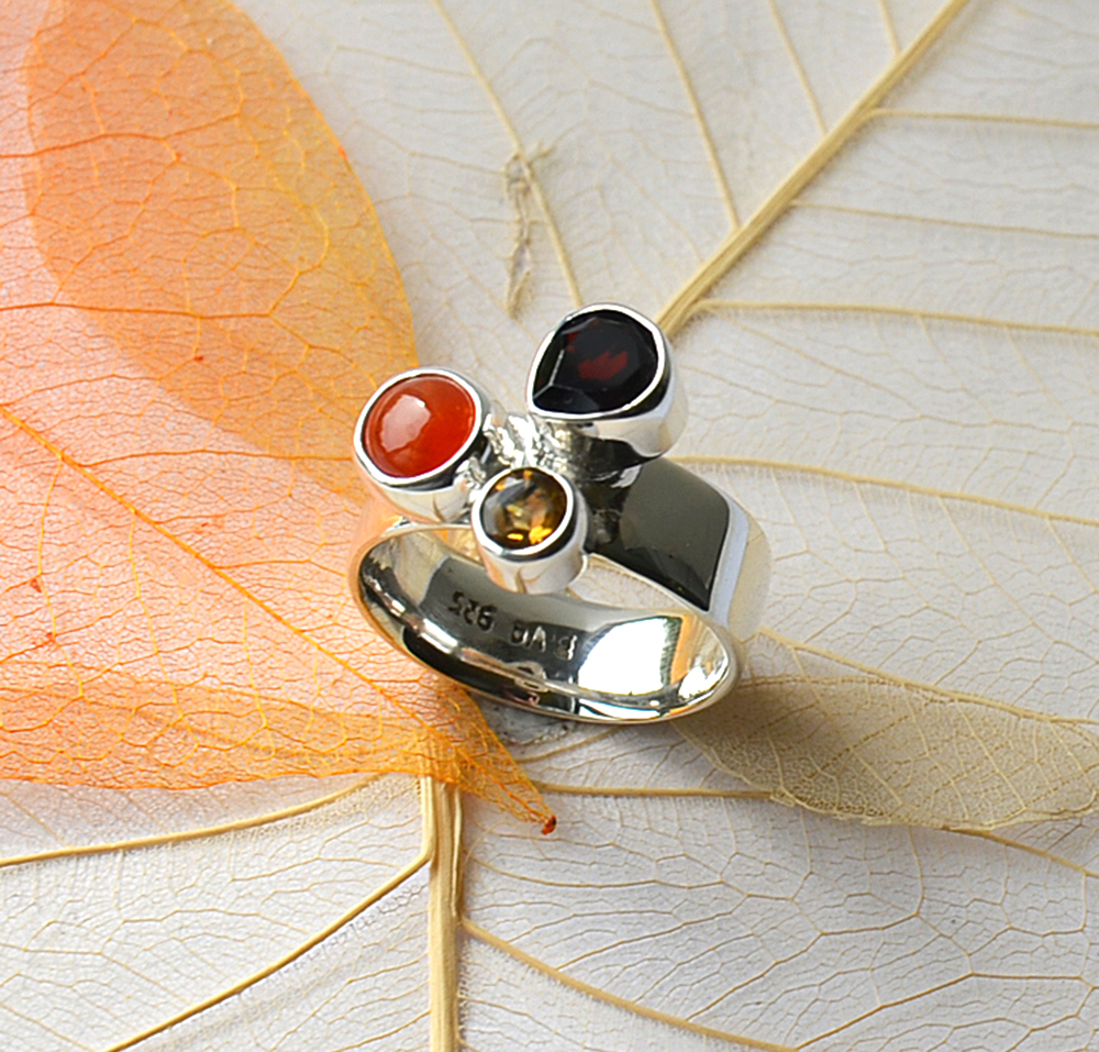Silberring - 925 Silber - mit Granat fac., Citrin fac., Karneol cab. breite, stabile Ringschiene Ein ganz besonderes Schmuckstück.